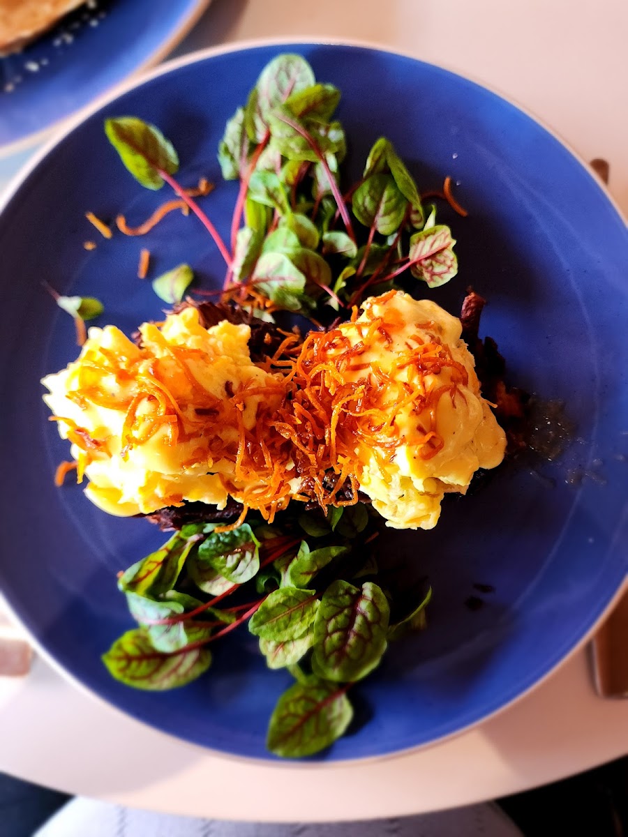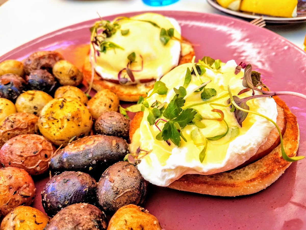 Best potato pancakes we've ever had! Definitely worthy of the award, accolades and reviews! Order this item!!! First the ambiance of the hotel lobby is beautiful! Really classy joint! We had brunch outside though since we had our dog and found the tables stained and still dirty from spilled juice from earlier guests. While we enjoyed the bright colors on the benches and sun panels, I found the stains unpleasant. Ambiance 4/5 We really liked they started off complimentary shooters of their smoothie of the day, it was nice welcome drink! We ordered chicken Caesar salad (most beautifully presented with a circular crouton dish!), potato pancakes (also creatively presented), eggs Benedict and French toast. Presentation of the food is truly polished and intentional - very nice!! It was a feast for the eyes and taste buds! We did find the French toast to be too sweet and we weren't able to finish due to sweetness. Food 4/5 Prices are fairly high for Palm Springs. It wouldn't be a regular outing due to cost but I would definitely return for the potato pancakes! Service was friendlish but felt transactional and was inconsistent. Value/service 4/5 Parking via valet only but they do validate to subsidize the parking cost.